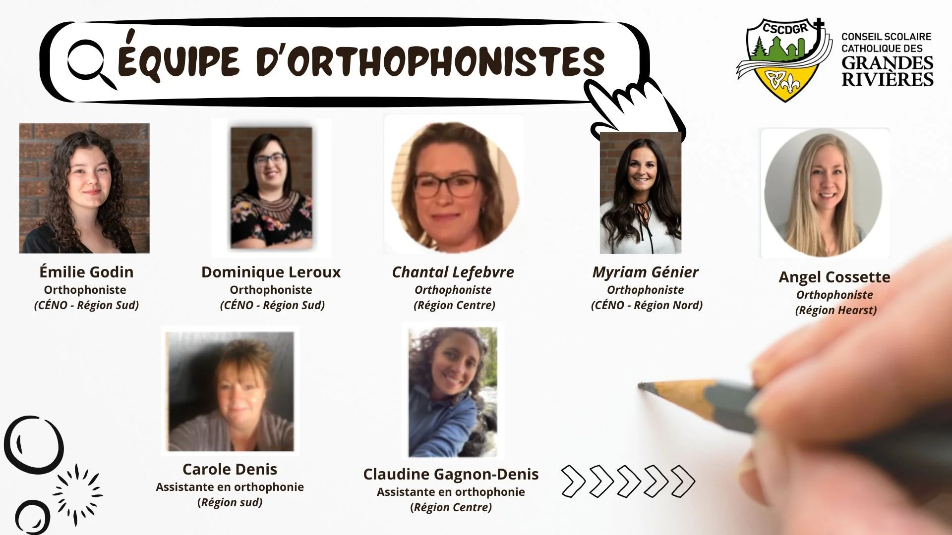 Le CSCDGR profite des services de deux orthophonistes embauchées directement par le Conseil, de trois orthophonistes du Consortium pour les élèves du nord de l’Ontario (CÉNO), ainsi que de deux assistantes en orthophonie. Durant l’année scolaire, ces dernières ont offert des services en orthophonie à plus de 245 élèves d’un bout à l’autre du Conseil.