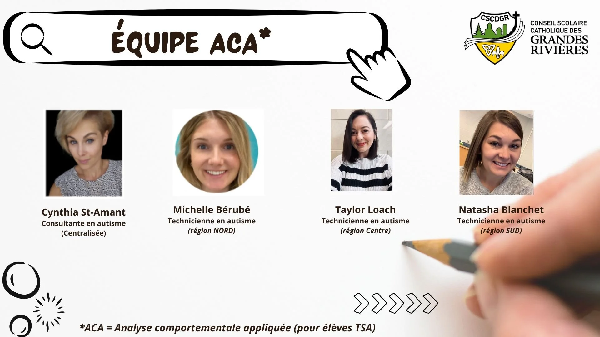 Le Conseil profite de l’expertise d’une analyste du comportement qui supervise une équipe composée de trois techniciennes spécialisées en autisme. Ensemble, elles servent toutes les régions du Conseil en offrant des services en analyse comportementale appliquée (ACA). Pendant l’année scolaire, cette équipe a accompagné 28 élèves ayant un diagnostic de trouble du spectre de l’autisme, en leur offrant un soutien en ACA adapté à leurs besoins, allant de modéré à intensif. Ce soutien comprenait des rencontres avec les équipes-écoles, la collecte d’informations pour mieux comprendre les besoins de l’élève, la création de plans d’intervention personnalisés, ainsi que du soutien direct en classe pour aider les élèves et les membres du personnel.